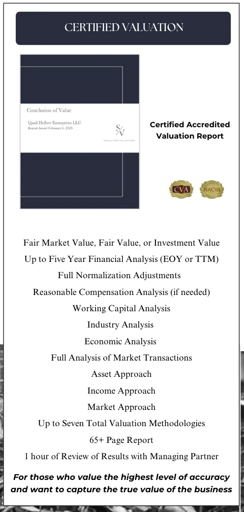 Our Standard Certified Valuations, follow all procedures outlined by NACVA to issue an accredited Business Valuation. The end product is a 65+ page certified report, with up to seven methodologies, a full analysis of normalization adjustments, full reconciliation of working capital and retained assets. This report gives clients “peace of mind” with a thorough and complete analysis that is well documented in the end report.