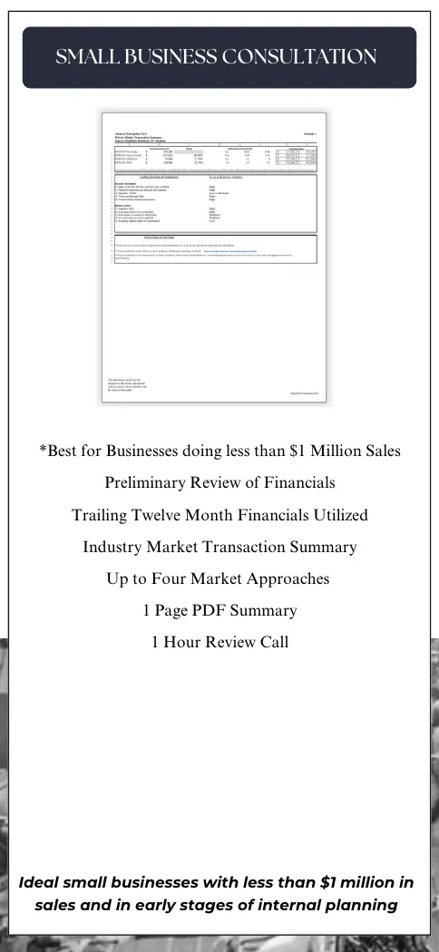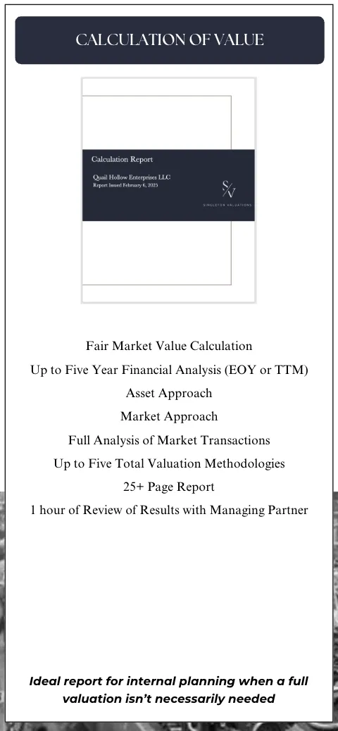 Our Business Calculation - Lite reports are tailored as cost-effective solutions to help with internal planning. The end product is a 25+ page non-certified report with up to five methodologies that incorporates real private market transaction data and asset oriented approaches